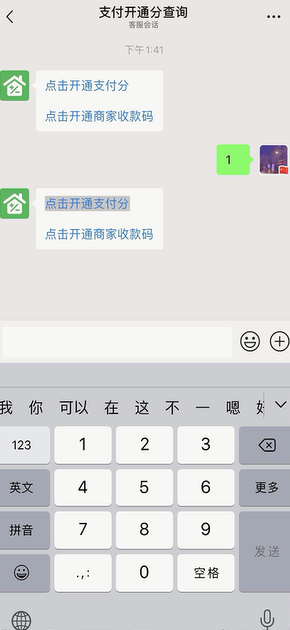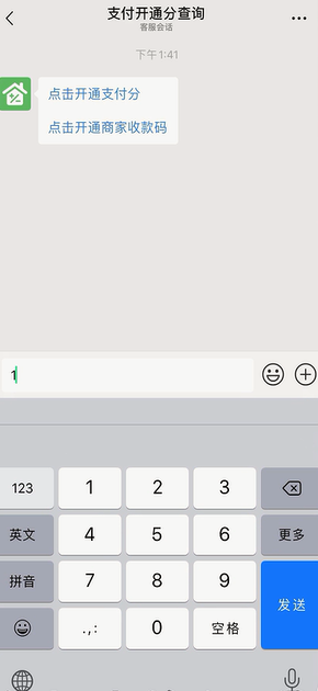 3、选择“点我回复数字1开通支付分”在回复框中输入“1”,点击“发送”。