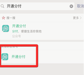 1、打开微信,搜索框中输入“开通分付”并搜索,选择“开通分付”公众号进入。