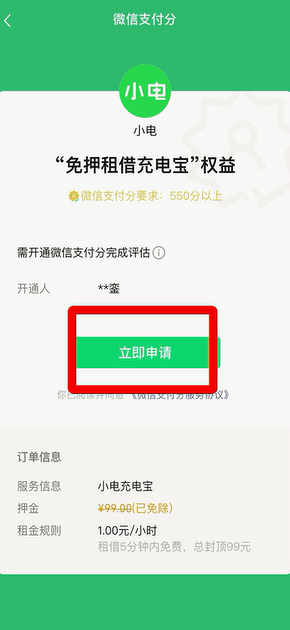 7、点击“立即申请”开通免密支付,输入密码即可开通微信支付分。