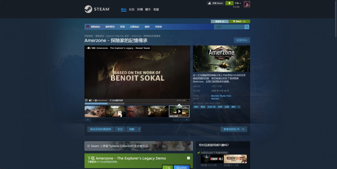 Steam平台需要先安装Steam平台,之后注册一个账号登录,然后搜索“Amerzone - 探險家的記憶傳承”进入商店购买页面。