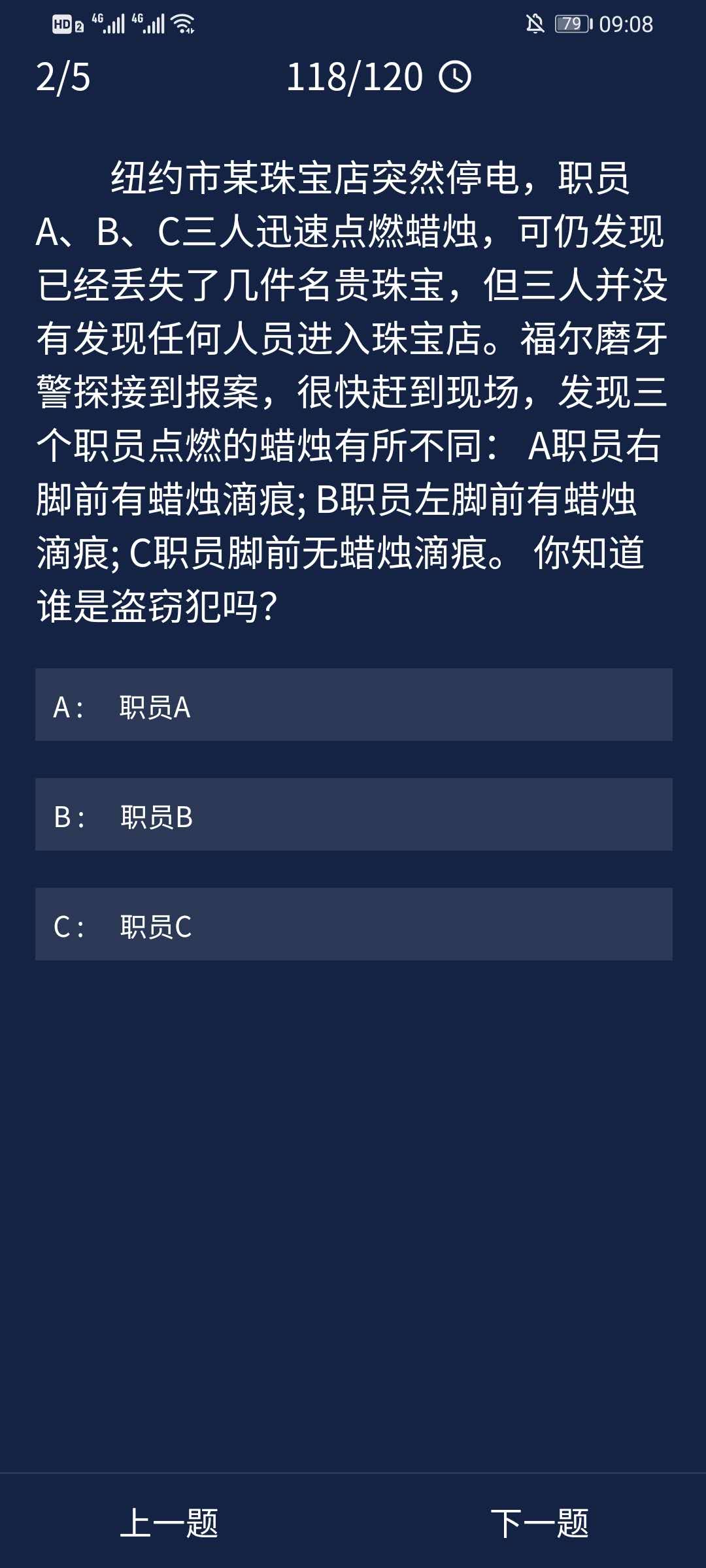 2、纽约市某珠宝店突然停电,职员A、B、C三人迅速点燃蜡烛,可仍发现已经丢失了几件名贵珠宝,但三人并没有发现任何人员进入珠宝店。福尔磨牙警探接到报案,很快赶到现场,发现三个职员点燃的蜡烛有所不同: A职员右脚前有蜡烛滴痕; B职员左脚前有蜡烛滴痕; C职员脚前无蜡烛滴痕。你知道谁是盗窃犯吗?