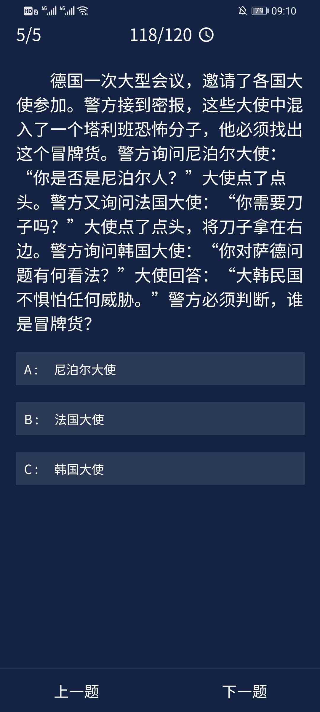 5、德国一次大型会议,邀请了各国大使参加。警方接到密报,这些大使中混入了一个塔利班恐怖分子,他必须找出这个冒牌货。警方询问尼泊尔大使:“你是否是尼泊尔人?”大使点了点头。警方又询问法国大使:“你需 要刀子吗?大使点了 点头,将刀子拿在右边。警方询问韩国大使:“你对萨德问题有何看法?”大使回答:“大韩民国不惧怕任何威胁。”警方必须判断,谁是冒牌货?