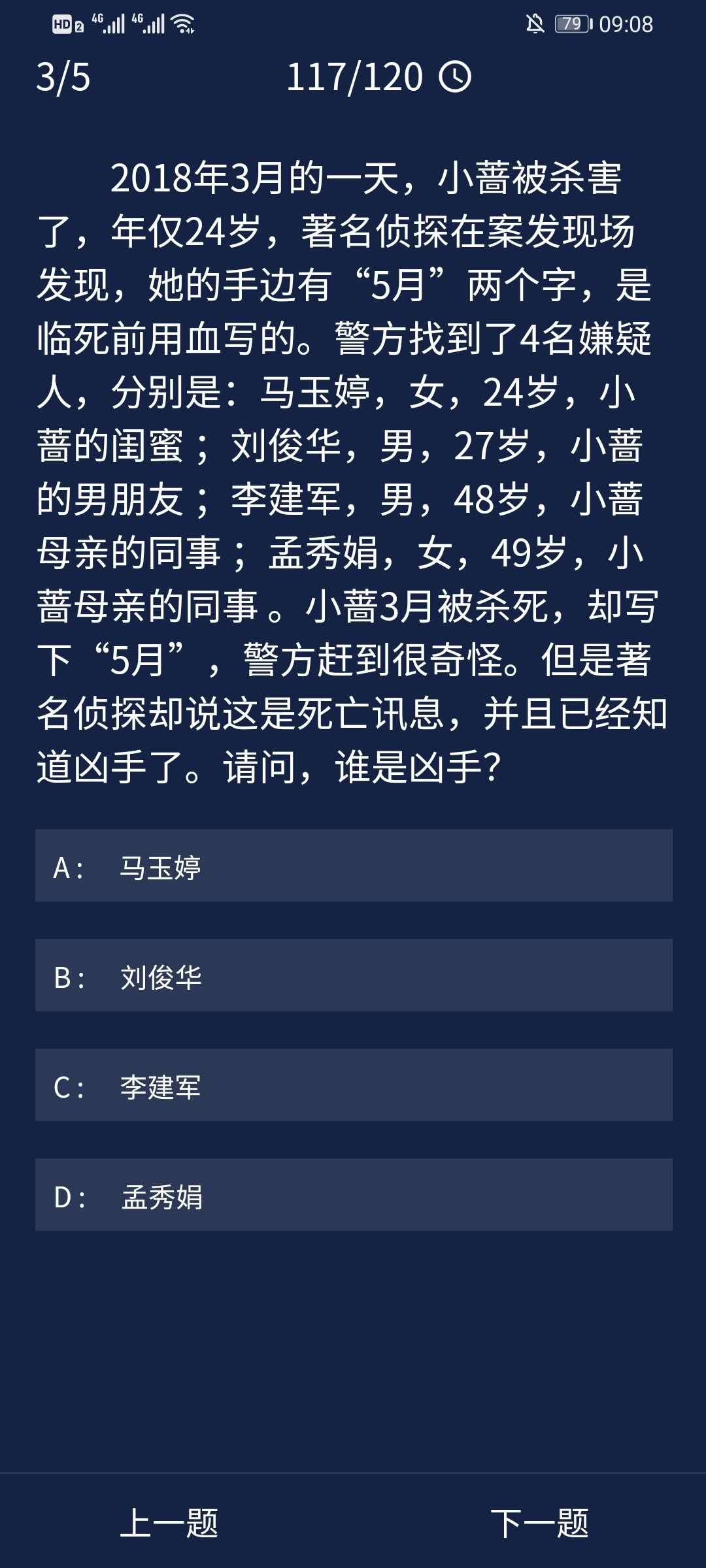 3、2018年3月的一天,小蔷被杀害了,年仅24岁,著名侦探在案发现场发现,她的手边有“5月” 两个字,是临死前用血写的。警方找到了4名嫌疑人,分别是:马玉婷,女,24岁,小蔷的闺蜜;刘俊华,男,27岁,小蔷的男朋友;李建军,男,48岁,小蔷母亲的同事;孟秀娟,女,49岁,小蔷母亲的同事。小蔷3月被杀死,却写下“5月”,警方赶到很奇怪。但是著名侦探却说这是死亡讯息,并且已经知道凶手了。请问,谁是凶手?