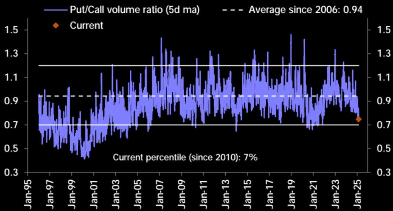 看涨期权净成交量攀升,使看跌期权/看涨期权成交量比率达到了2021年末疫情期间股票繁荣时期的水平。