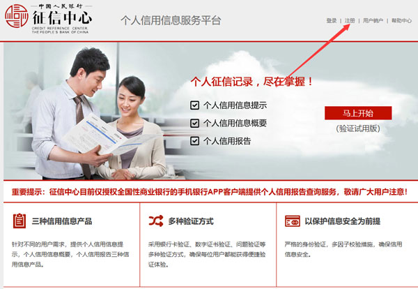 2.在打开的个人信用信息服务平台中点击右上角的【注册】按钮开始注册;