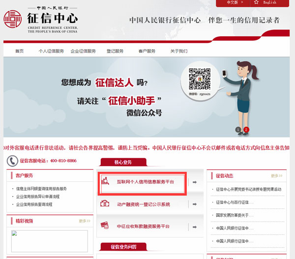 1.进入中国人民银行征信中心官网http://www.pbccrc.org.cn/,在首页点击【互联网个人信息信用服务平台】;