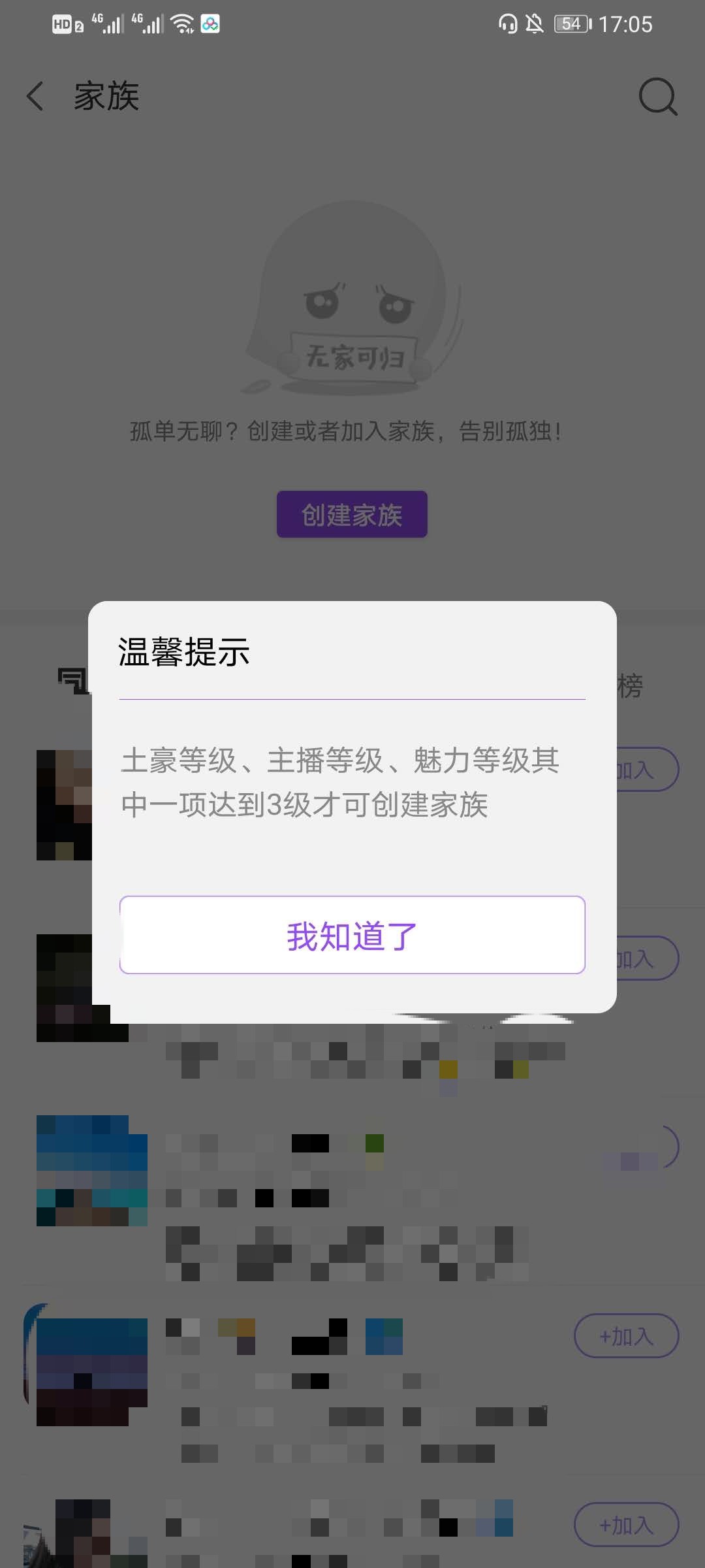 3、在家族界面,点击上方的创建家族(需要贵族才可以)。