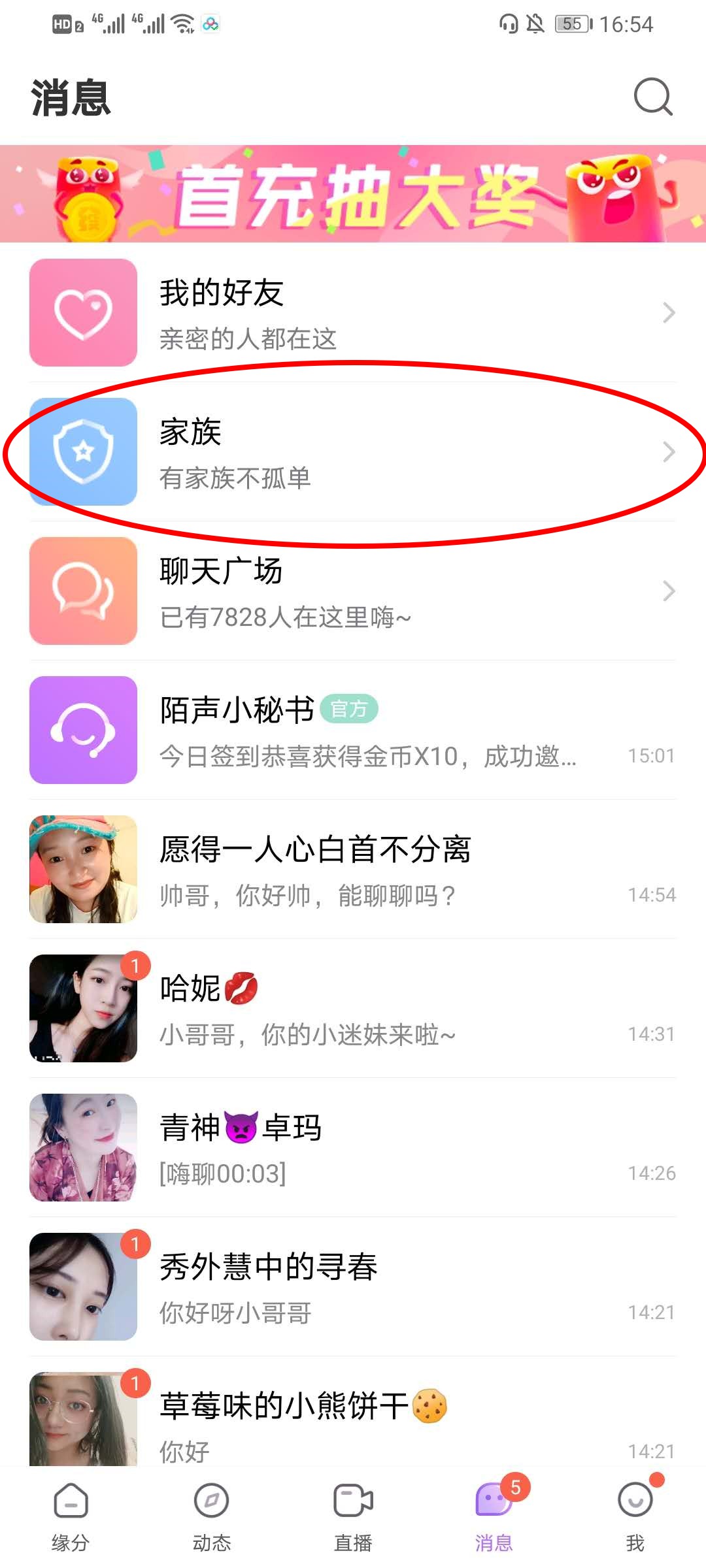 2、在消息界面点击家族。