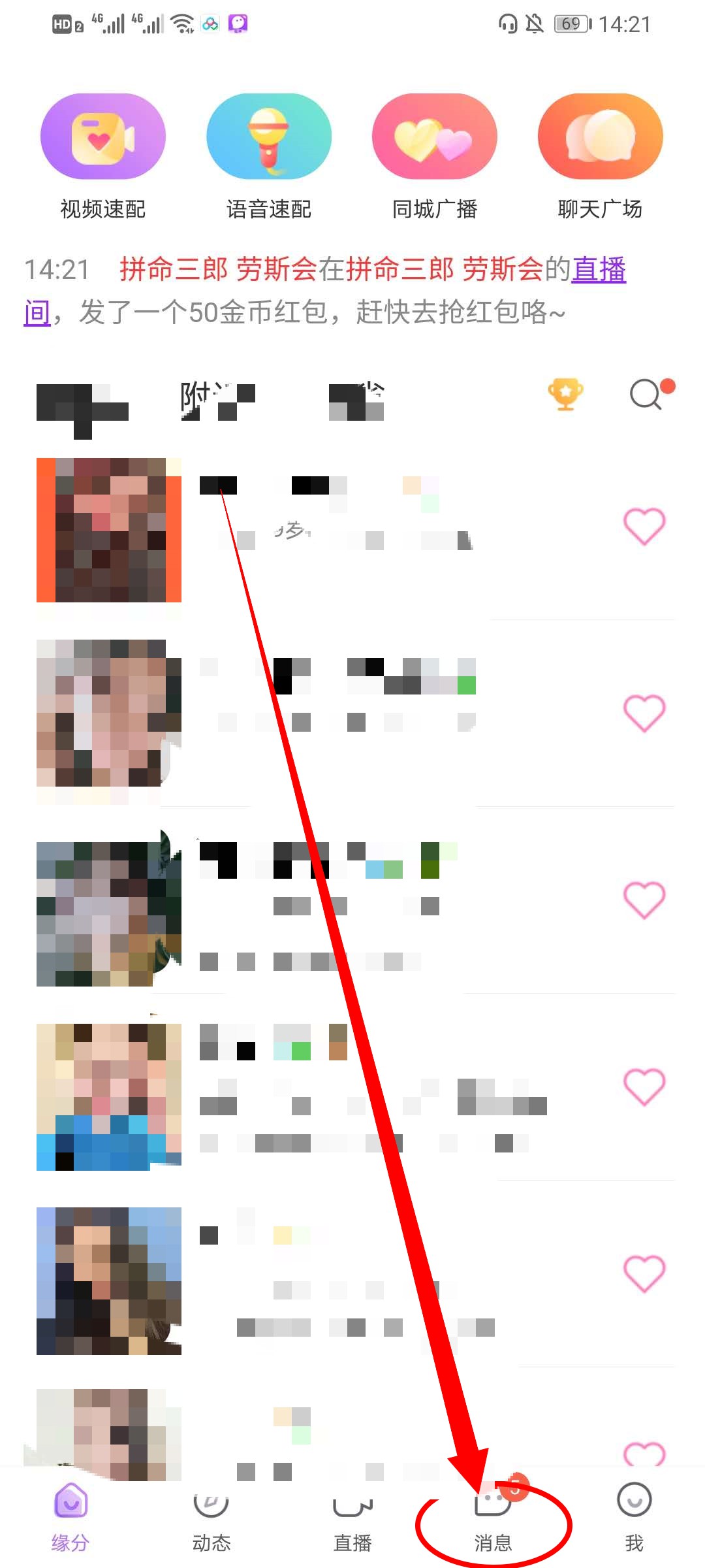 1、打开陌声交友软件app,在首页点击下方的消息。