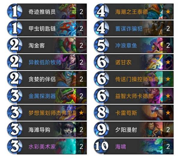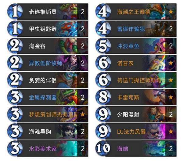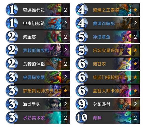 冲浪章鱼和DJ法力风暴都是启动点,这里之所以去掉这两个启动点,主要是为了加入一些其他的功能卡不得已做出的取舍,有这两个启动点可能更方便启动,但卡组也会缺失一些其它的(必要)功能,最新加入的四张卡是两张笨拙的搬运工,当你手里有五费(包括五费)以上法术时,会召唤出两个3/3的嘲讽搬运工,刚好可以搭配大法术使用赚费 防快攻,一张星辰能量,挺好用的解场卡,可以群解也可以单解对面大哥,不加入两张是为了防卡手,一张刚刚好。