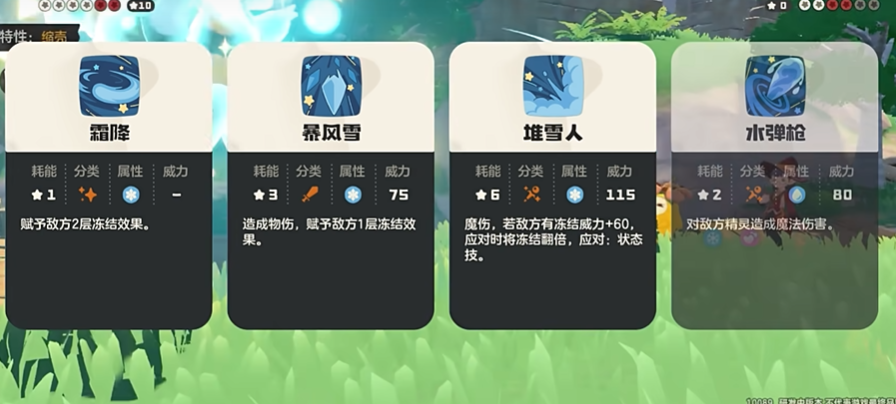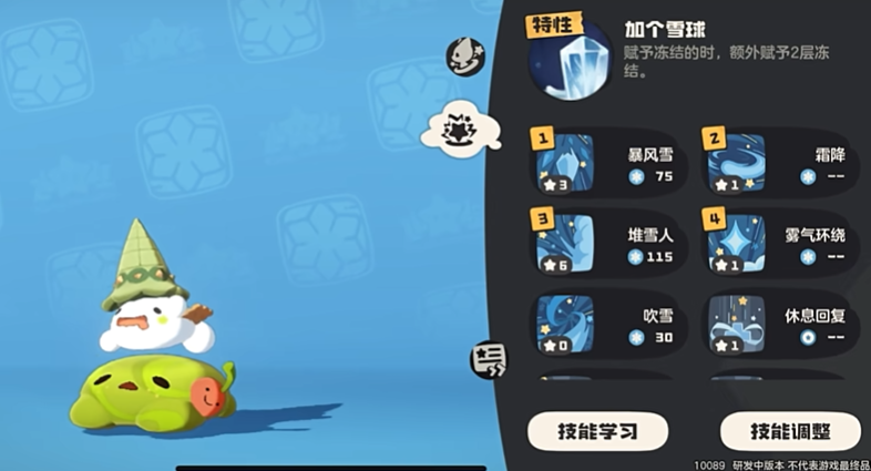 技能上有霜降、暴风雪、堆雪人和水弹枪,霜降一次可赋予敌方 2 层冻结效果,配合特性,能直接让对手有40%生命值被冻结,是开场建立优势的关键技能,在对战初期,首发圣代甜甜,直接使用霜降,给对手来个下马威,瞬间让对手陷入被动,暴风雪造成物理伤害的同时,赋予敌方1层冻结效果。它既能补充伤害,又能增加冻结层数,在霜降之后使用暴风雪,进一步扩大冻结优势,让对手的生存空间被不断压缩,堆雪人是魔攻技能,若敌方有冻结,威力提升60点,应对时还能将冻结翻倍,当对手已被施加冻结状态,使用堆雪人,能打出高额伤害,是圣代甜甜输出的重要保障,水弹枪是常规魔攻输出技能,提供稳定的魔法伤害,在技能循环中,水弹枪可作为填充技能,保证伤害的连贯性,避免技能真空期。