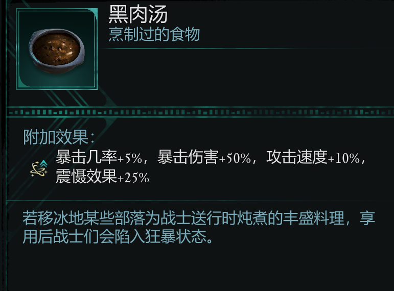 黑肉汤:暴击几率 5%,暴击伤害 50%,攻击速度 10%,震慑效果 25%。