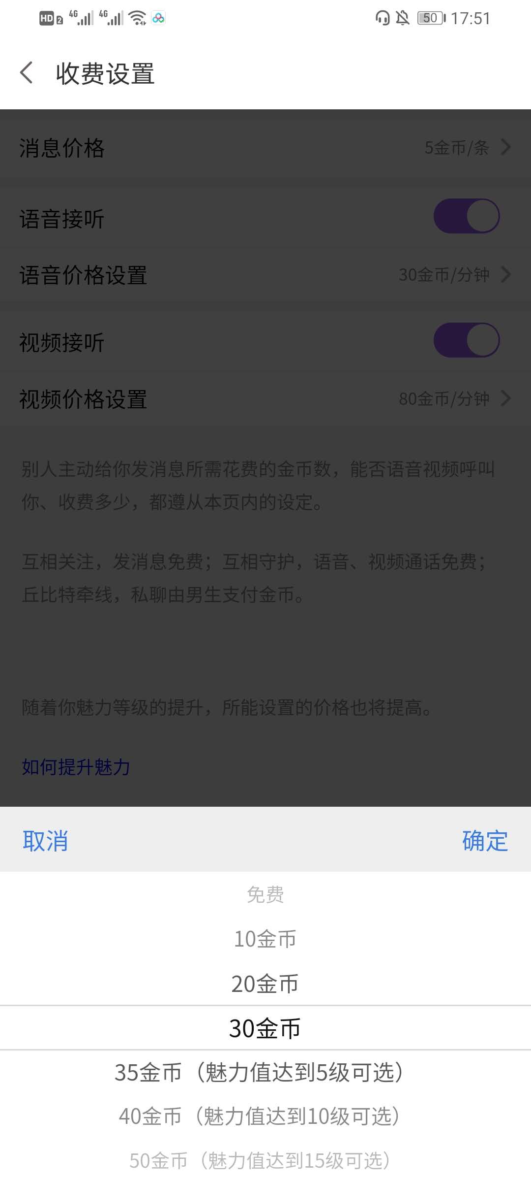 4、在收费设置界面,点击语音价格设置,在弹出的选项中,点击想要修改的价格即可。