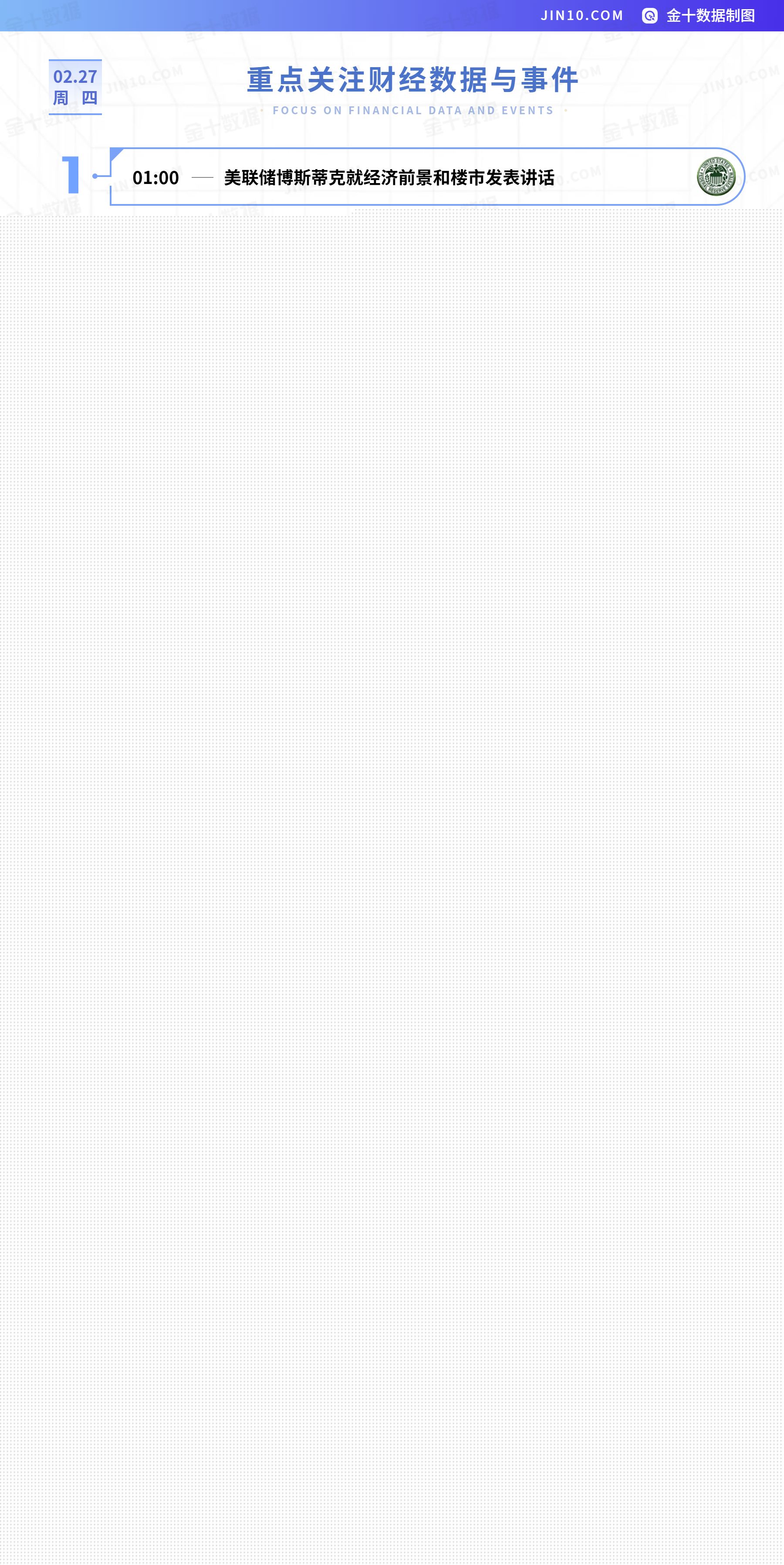 23点,美国将公布1月成屋签约销售指数月率,另外,美联储理事巴尔也将就“新活动监管”发表讲话;