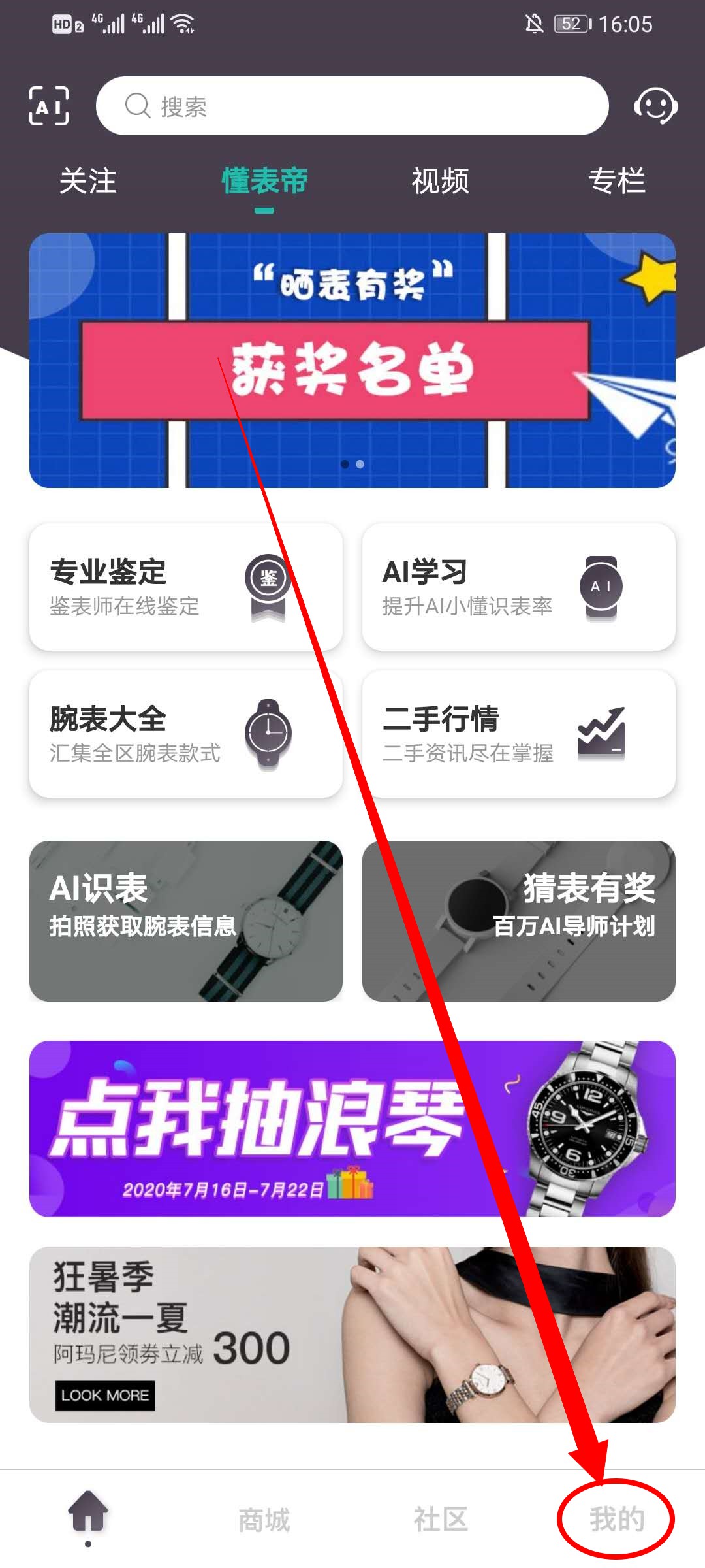 1、打开懂表帝app,在首页点击右下方的我的。