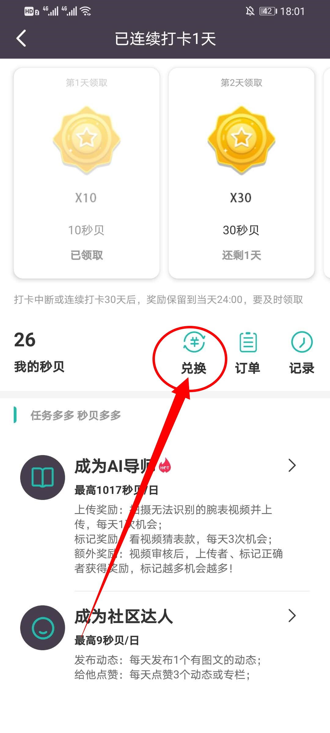 3、在秒贝界面点击兑换,进入兑换界面。
