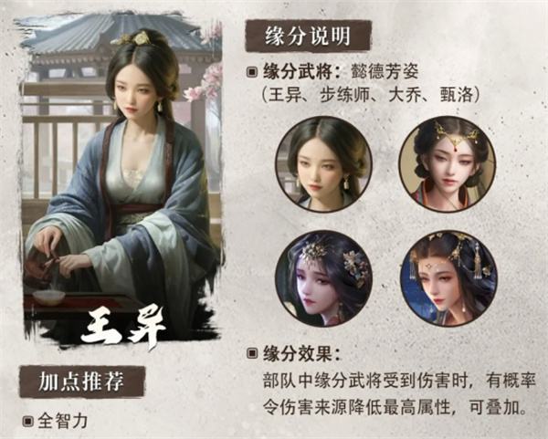 三国中有众多具有独特的才能和魅力的女性,我们通过让王异与步练师、大乔、甄洛建立缘分“懿德芳姿!”,以体现她们在历史中展现出的高尚品德与非凡魅力。