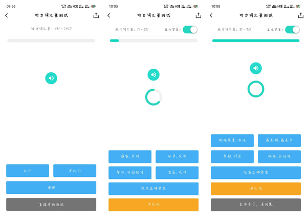 4.点击【开始测试】听力词汇量,听力词汇量需要根据播报的英语单词,在下方的选项中选出正确答案,同样也可以选择没有答案、不认识,同样根据上方进度条查看测试数量,结束时需要手动选择结束。