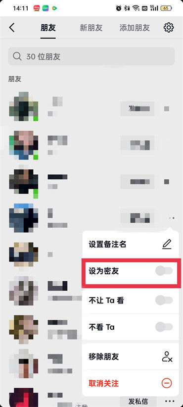 5.最后在弹出来的对话框中点击并开启【设为密友】选项即可;