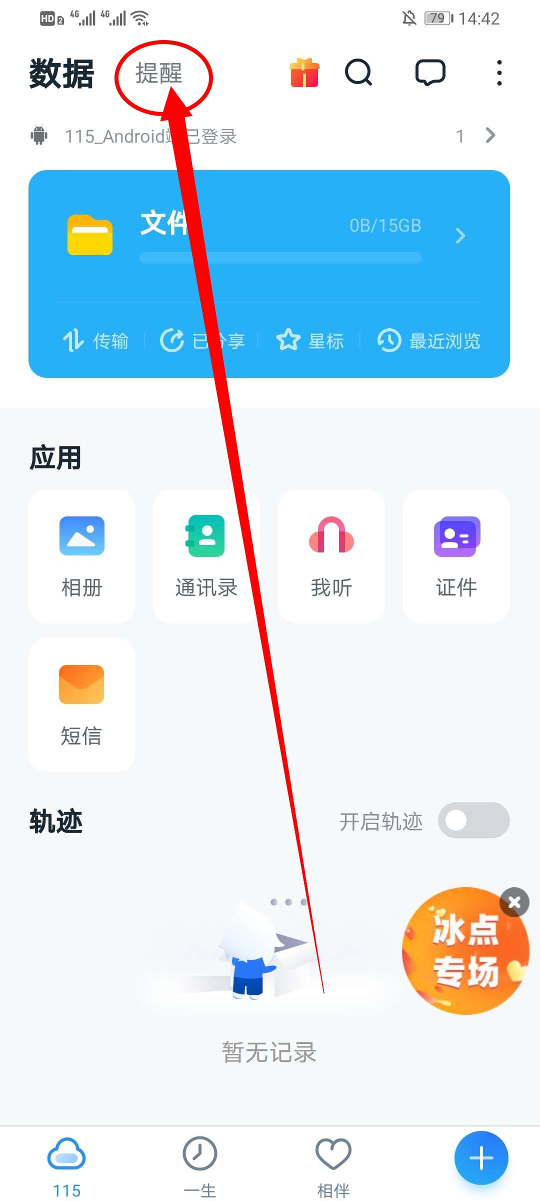 1、打开115网盘,在首页点击左上方的提醒。