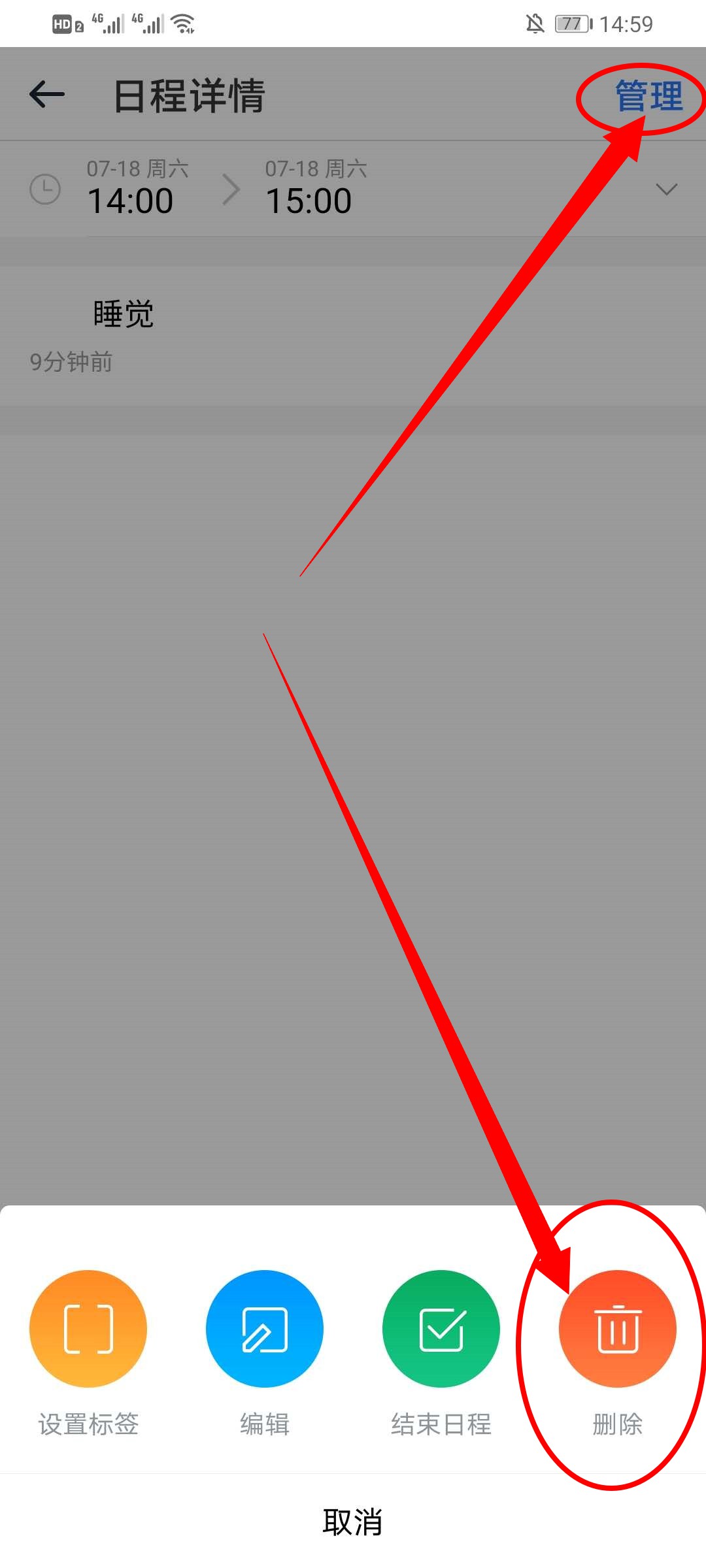 3、点击进入,在日程界面点击管理,在弹出的界面中点击删除即可。