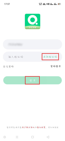 6.点击【获取验证码】按钮,在收到短信验证码后,将验证码输入到输入框中,点击【登录】进入小七学伴APP内,再根据以上的方法重置密码;