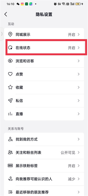 4.来到隐私设置的页面之后点击【在线状态】;