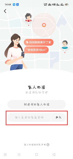 4.家人收到密码之后,按照上方方法进入家人地图,在输入框中输入家庭密码,点击【加入】即可加入到我们的家人地图中;