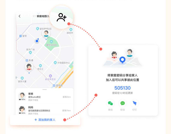 7.也可以在家人地图页面点击右上角的【 】邀请家人按钮或者最下方的【添加我的家人】复制口令或者密码分享给家人,邀请他们加入即可。