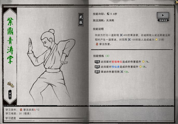 5、功法:优先选择增加掌法伤害、内伤伤害、体力上限、防御力等属性的功法。