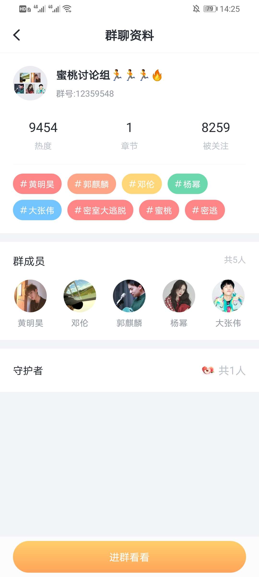 4、点击群后方的进入,可以进入到群的资料界面,点击下方的进群看看,进入群连天界面。