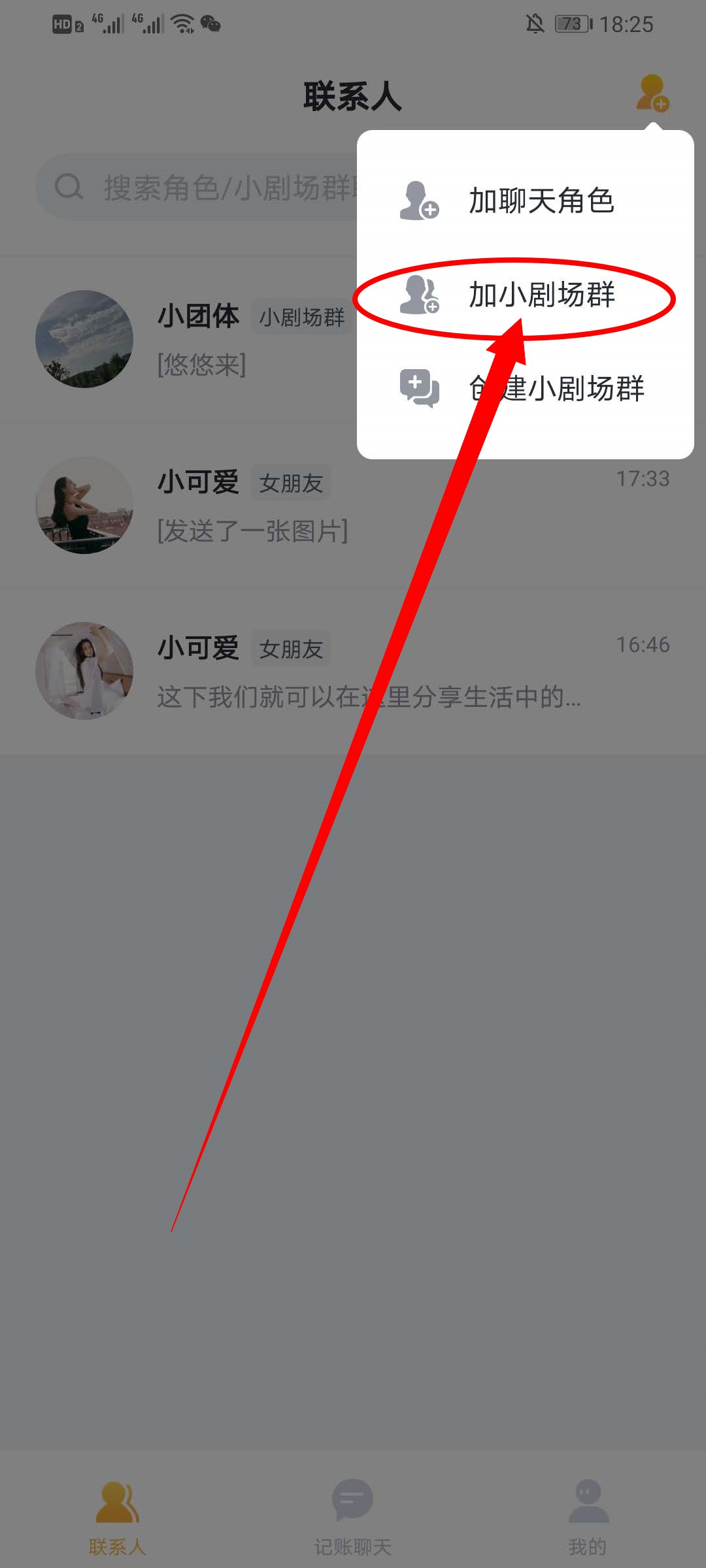 2、在联系人界面点击右上角的小人标志,在弹出的选项中,点击加小剧场群。