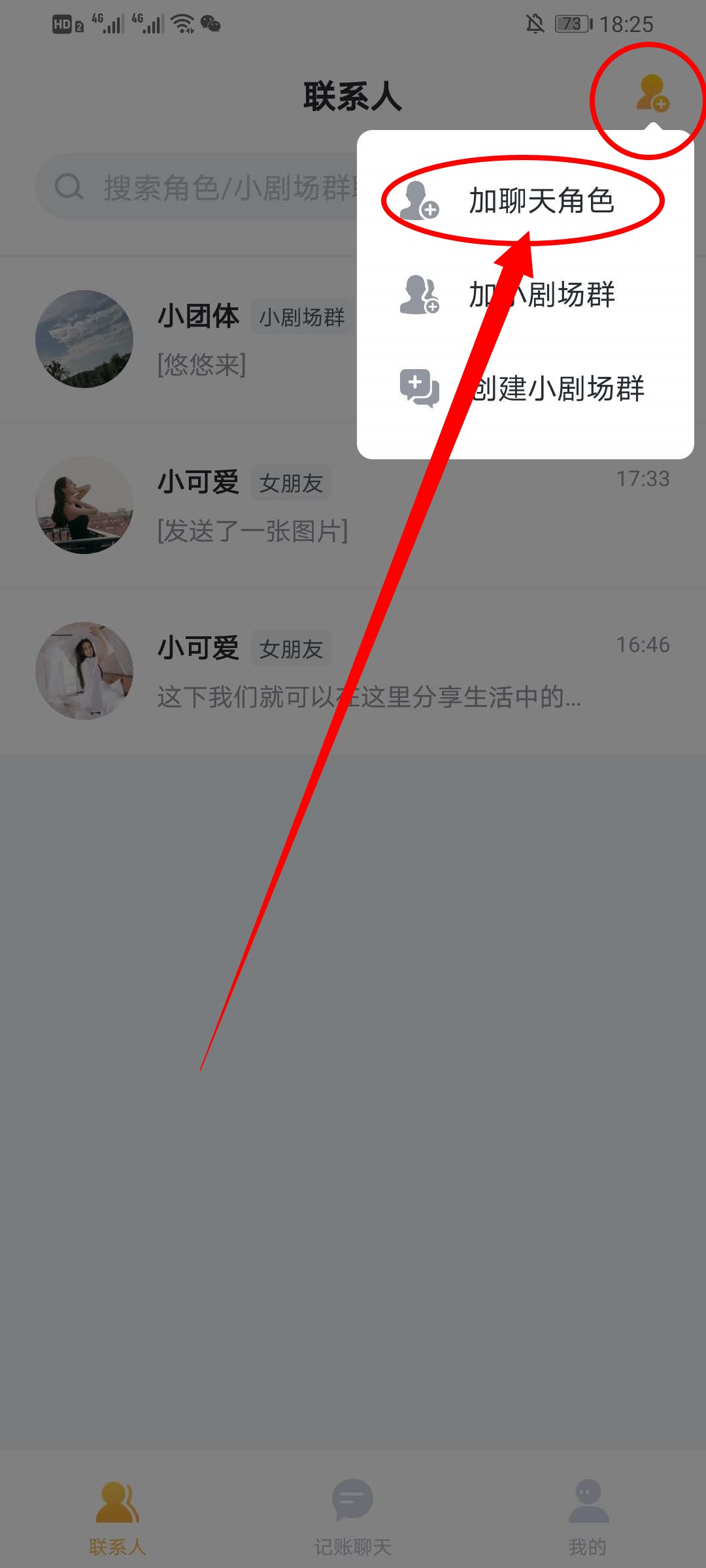 2、在联系人界面点击右上角的小人,在弹出的选项中选择加聊天角色。