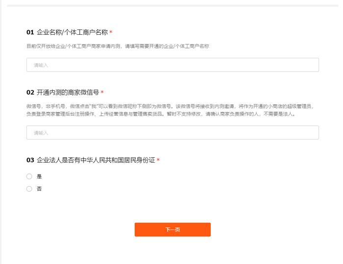 3.进入内测申请页面之后,我们需要填写:企业名称/个体工商户名称、开通内测的商家微信号等等,最后点击【下一页】填写所有的信息之后,点击【提交】;