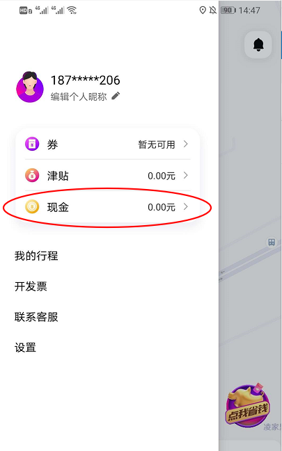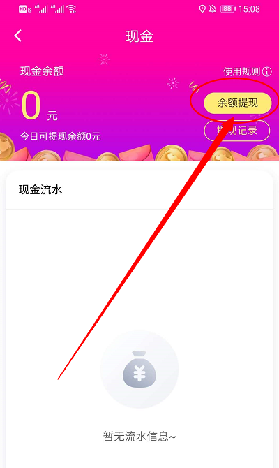 3、在现金界面,点击右上方的余额提现即可。(余额小于1.00元不可提现)