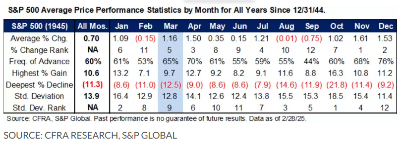 CFRA Research首席投资策略师萨姆·斯托瓦尔(Sam Stovall)提供的数据显示,自1945年以来,标普500指数在三月的平均回报率接近1.2%,并且65%的时间内实现上涨(见下图)。