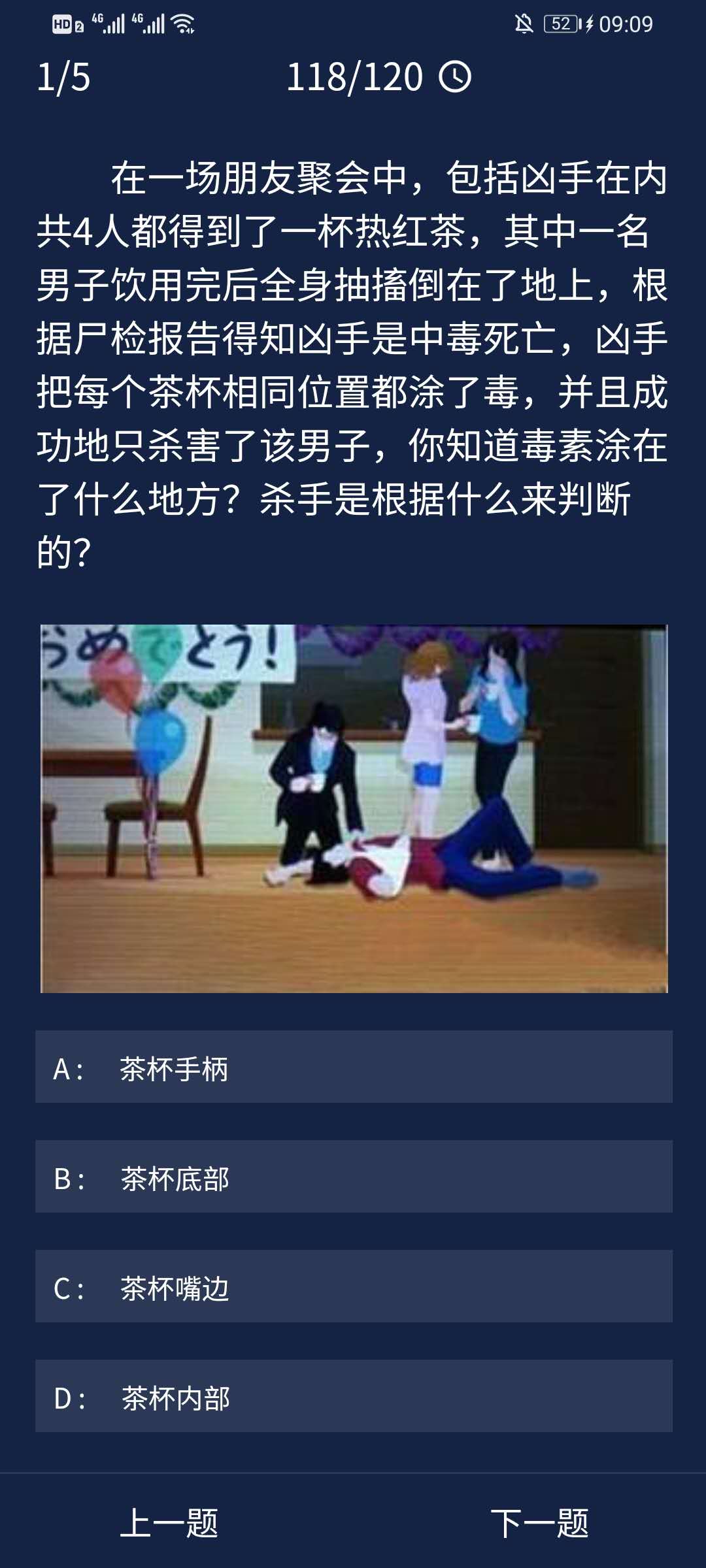 答案解析:聚会中的4人是朋友,因为其他三人(包括凶手)都是右撇子,死者是左撇子,所以凶手知道只有死者会喝到有毒素的那一边。
