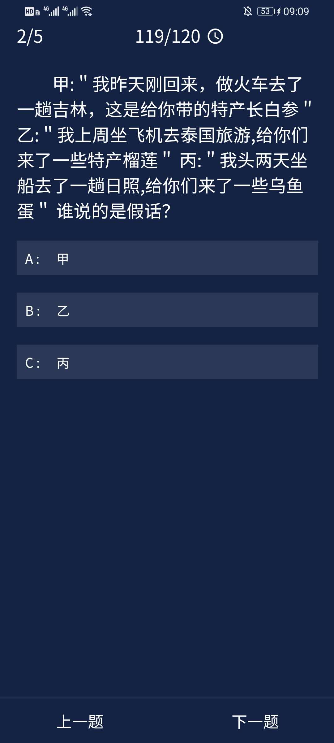 2、甲: "我昨天刚回来,做火车去了趟吉林, 这是给你带的特产长白参乙:"我上周坐飞机去泰国旅游,给你们来了一些特产榴莲"丙:"我头两天坐船去了一趟日照,给你们来了一些乌鱼蛋"谁说的是假话?