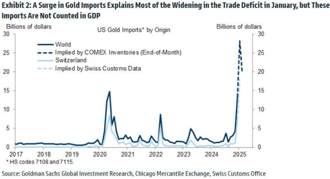 高盛的结论是,由于黄金进口对贸易数据的扭曲,最新数据被过度解读。该行预计美国第一季度GDP年化增长率为1.6%,略低于年初水平,但远高于亚特兰大联储的预期。