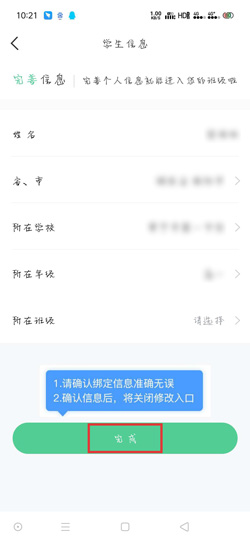 2.然后完善学生的个人信息就可以了,输入姓名、读书所在省/市、所在学校、年纪等等,点击【完成】,注意学生信息只能修改一次,设置完成后,修改入口将关闭;