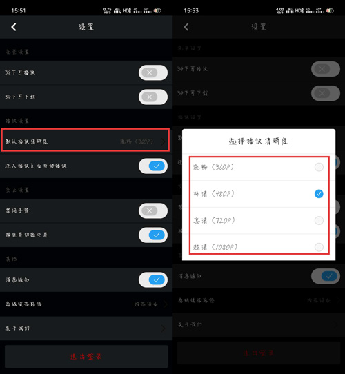 7.点击【默认播放清晰度】,将其修改为需要的视频清晰度,之后只要不手动修改设置、播放视频的中的清晰度,默认使用该清晰度播放视频、下载视频。