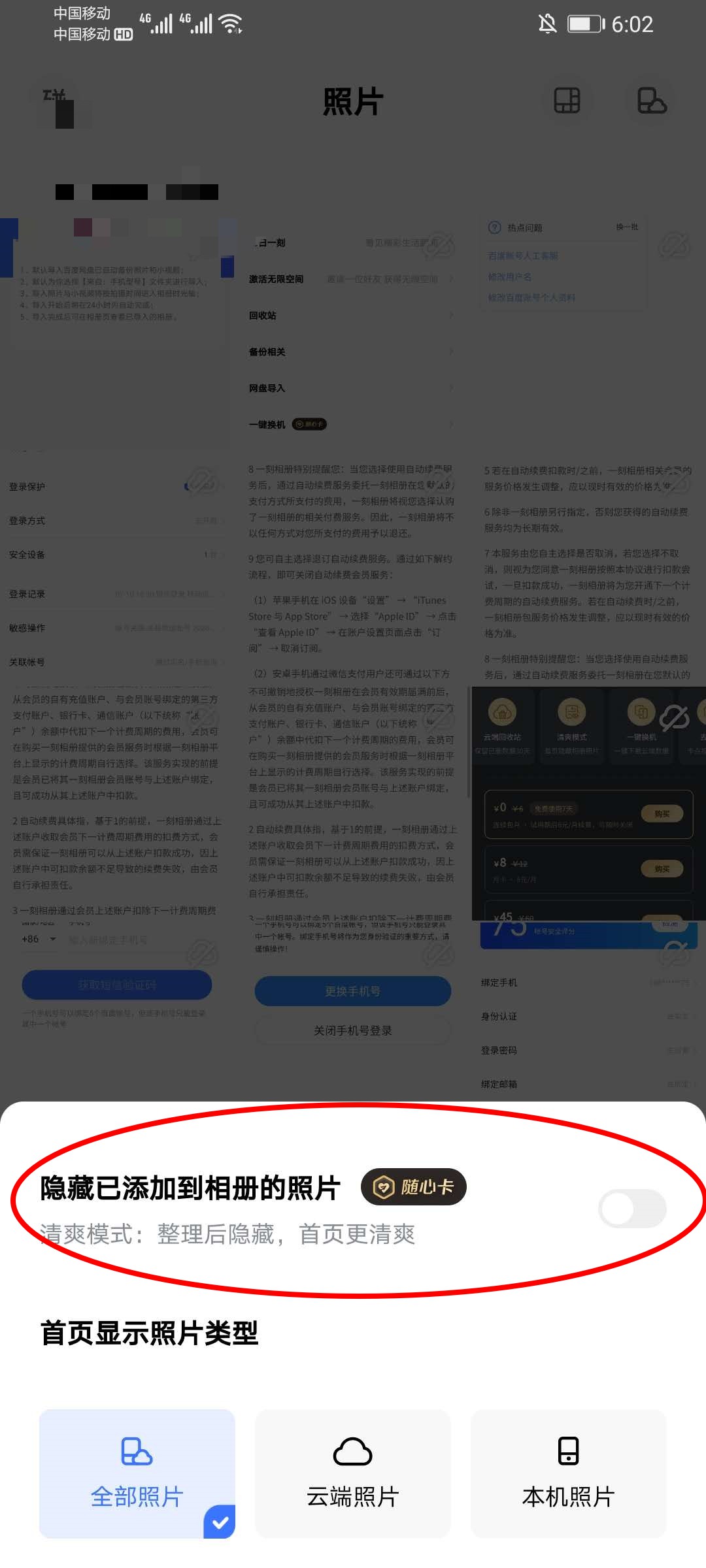 2、在点击完小图标后会在下方弹出选项,点击隐藏已添加的相册的照片打开即可(需要开通随心卡才可以使用)。