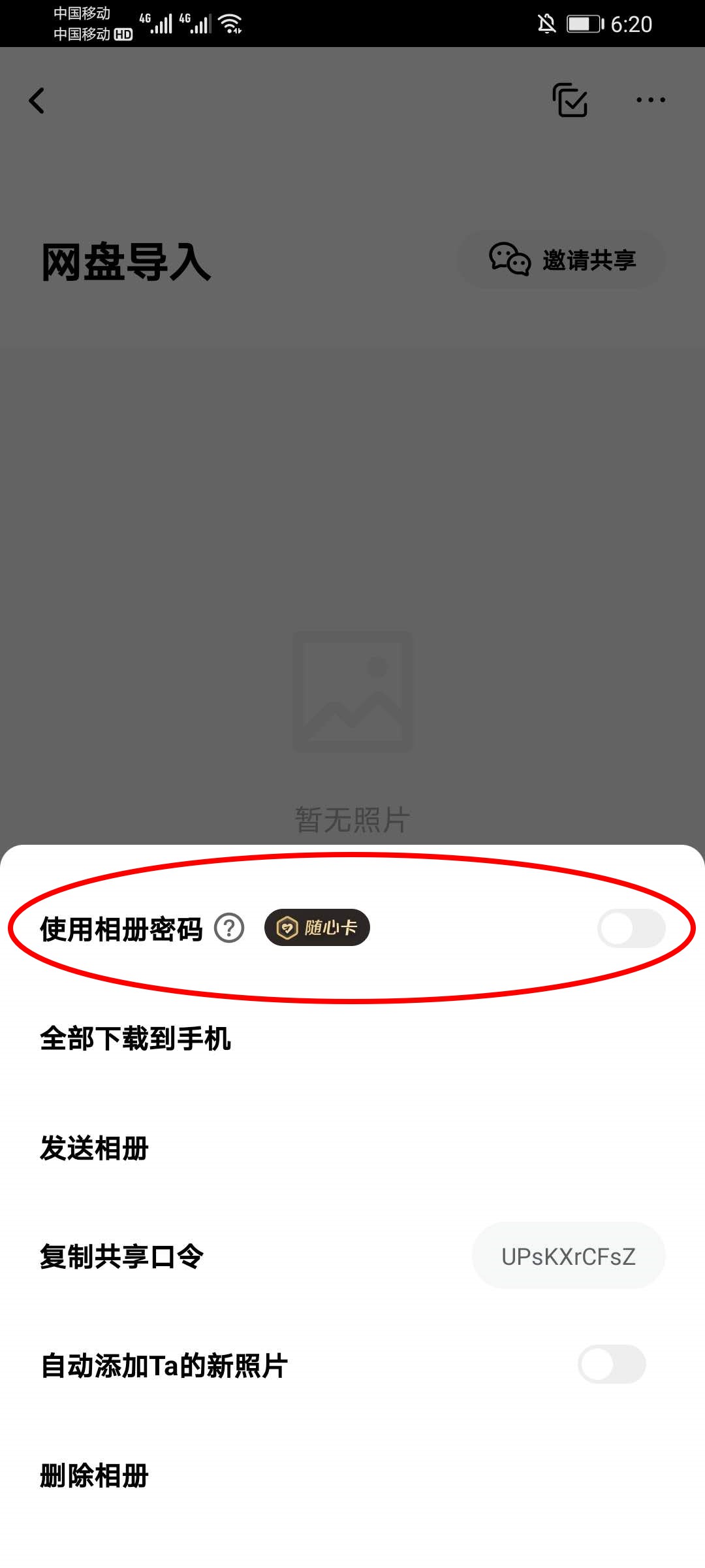 4、在弹出的界面中点击使用相册密码打开即可(开通随心卡才可以使用)。