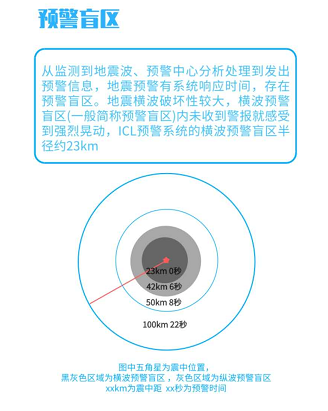 从监测到地震波、预警中心分析处理到发出预警信息,地震预警有系统响应时间,存在预警盲区。地震横波破坏性较大,横波预警盲区(一般简称预警盲区)内未收到警报就感受到强烈晃动,ICL预警系统的横波预警盲区半径约23km。