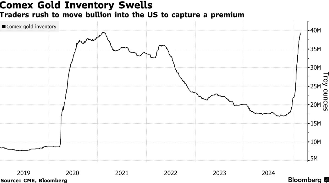 截至本周二,Comex存放处的黄金库存总量达到3950万盎司,为四年来最高。根据最新的交易员持仓(COT)报告,这几乎足以弥补黄金交易商、基金经理和其他参与者目前在交易所持有的空头头寸。上一次Comex仓库出现这样的飙升还是在新冠疫情期间,当时交易商克服了造成类似价差井喷的供应链中断。