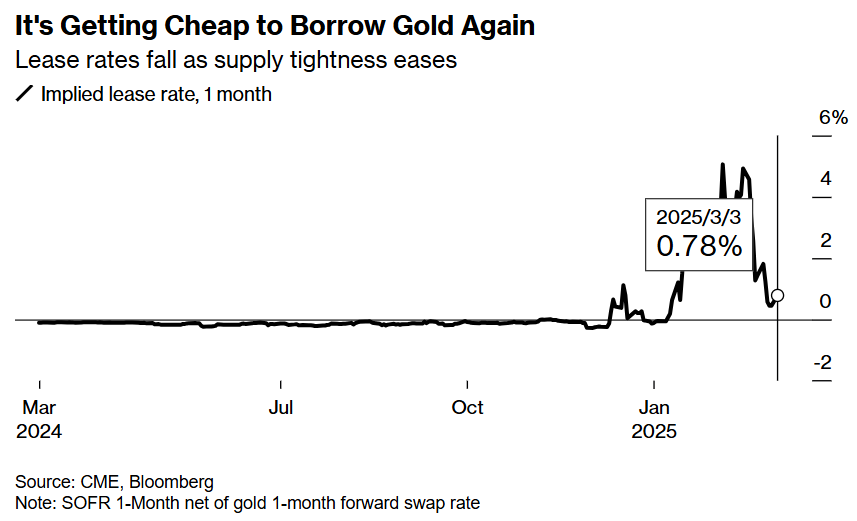 在伦敦租借黄金的租赁费率也在下降。隐含利率是用银行间资金成本减去黄金远期掉期利率得出的。今年1月,随着银行寻求获得黄金以交割Comex的空头头寸,隐含利率达到数十年来的最高点。现在它处于更正常的水平,接近零。