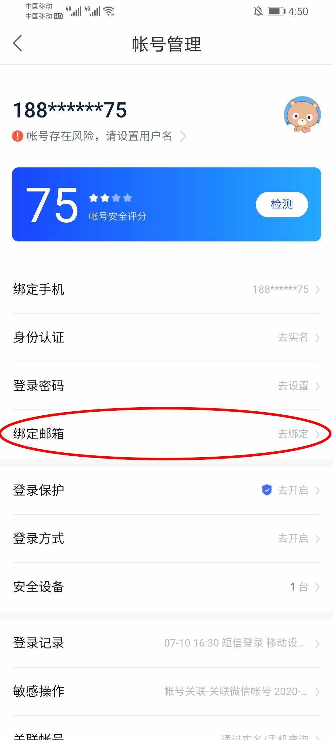 4、在账号管理中找到绑定邮箱