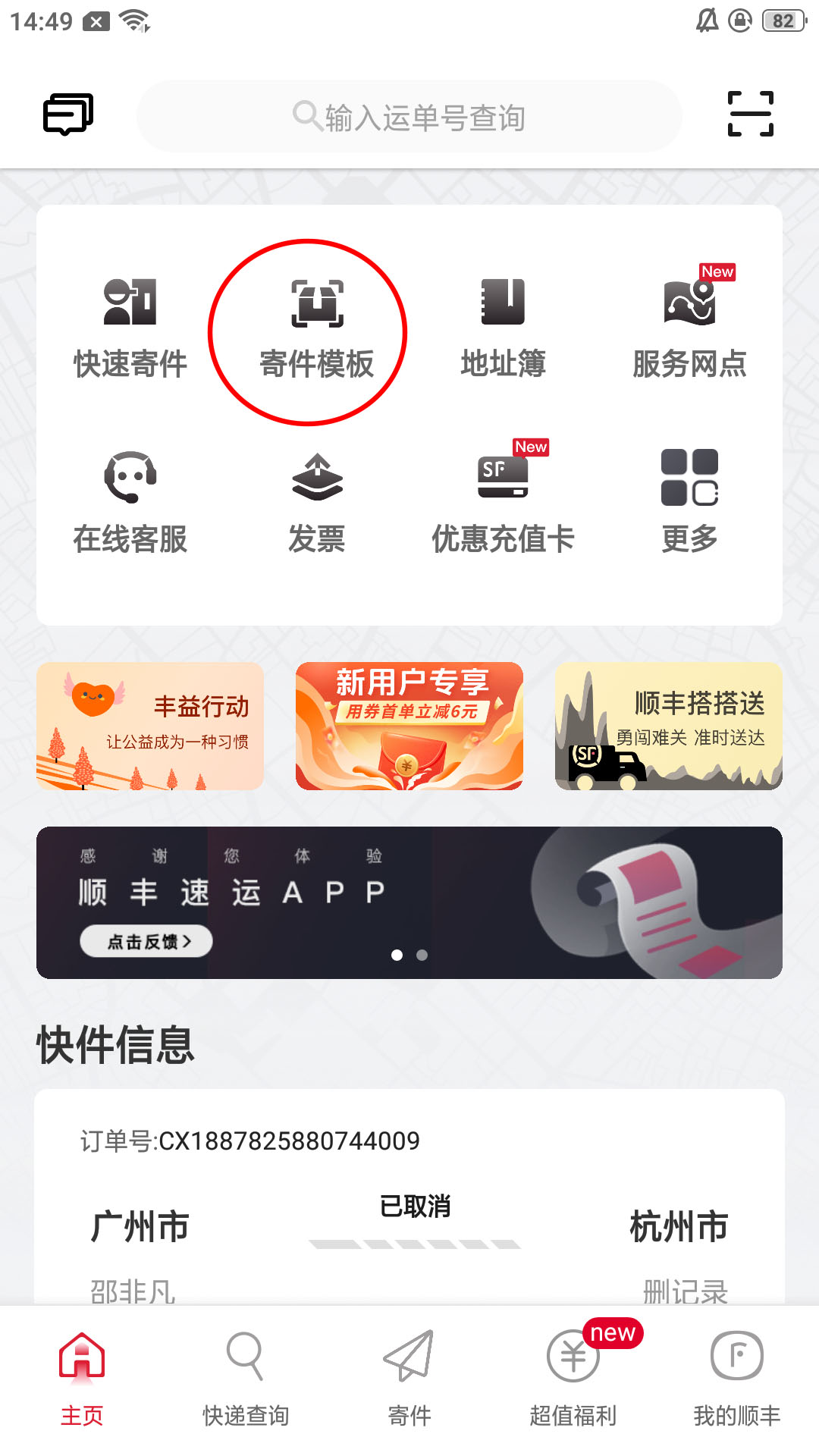 1、打开顺丰速运app,在首页点击上方的寄件模板。
