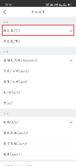 4.找到“温度”一项,将单位修改为【摄氏度】,点击“摄氏度”,当右侧出现勾时,返回首页;