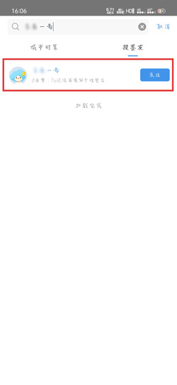 4.输入完整的昵称之后,会在下方显示搜索到对应昵称的用户,我们可以根据头像判断是否是我们需要添加的用户,点击【关注】(如果搜索出来有很多,可以查看昵称为蓝色字体的用户);